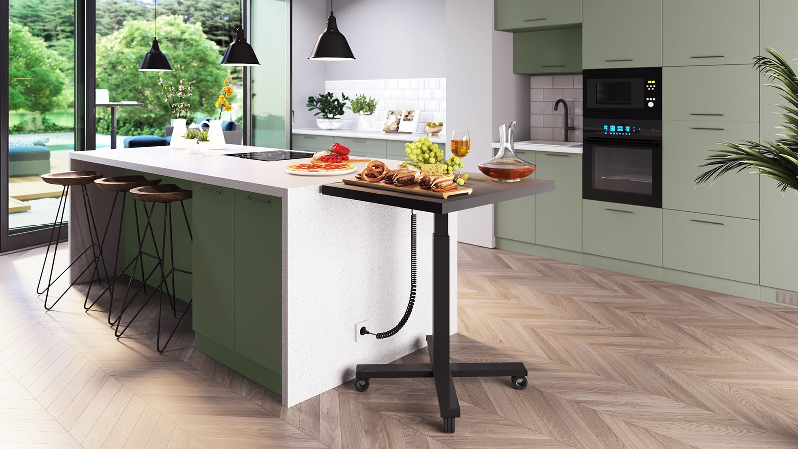 Die robuste 1‑Säulen-Konstruktion trägt bis zu 60 kg dynamisch. Der elektrische Antrieb arbeitet angenehm leise (< 55 dB(A)) – ideal für konzentriertes Arbeiten.